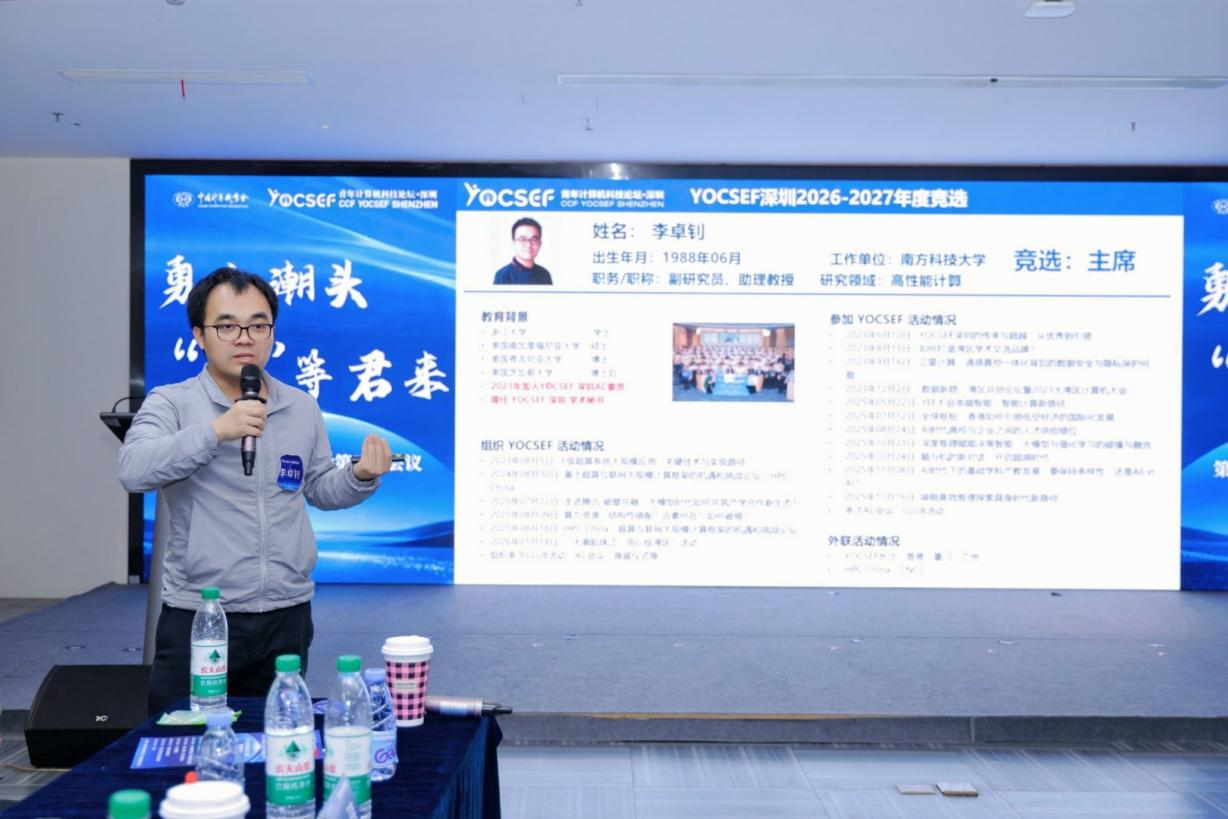 学术秘书选举换届由张莹主持,梁骁俊(鹏城实验室)、刘文万(中科曙光)、段海涵(深圳北理莫斯科大学)、白瑞(锐软科技(深圳)有限公司)参与了竞选。4人分别述了各自的经历、优势和工作设想,经过集体提问与投票,梁骁俊(鹏城实验室)、段海涵(深圳北理莫斯科大学)当选为2026-2027年度CCF YOCSEF深圳学术委员会候任AC学术秘书。