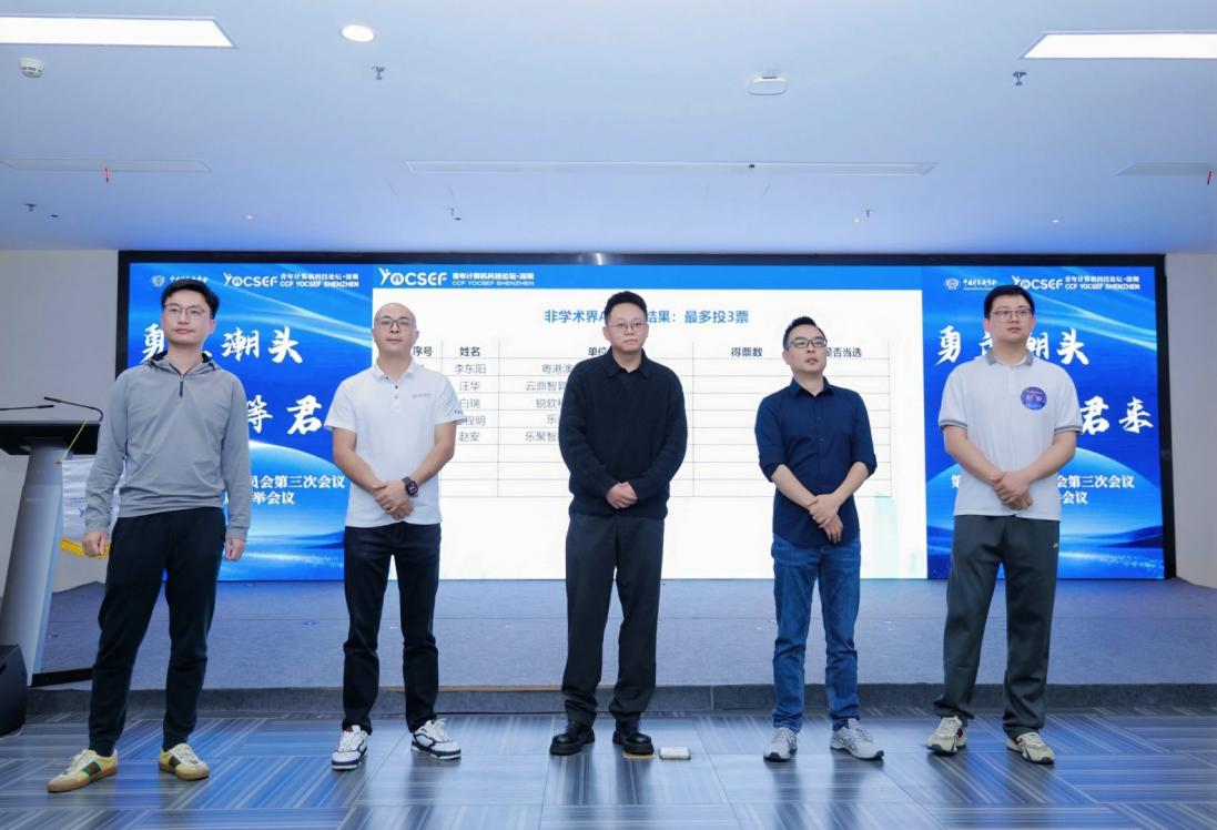 本次AC委员竞选十分激烈,吸引了多名来自不同领域、具有多元化背景的优秀候选人参选。共有来自5所高校、科研院所的5名候选人申请学术界AC委员,和来自5家不同企业的5名候选人申请非学术届AC委员。在整个AC委员增选过程中,AC委员候选人们不仅进行了精彩的竞选演讲,而且在现场面对激烈的集体提问时,给予了充分而精彩的回答。这一过程中,不论是学术界AC委员还是非学术界AC委员的竞选,都呈现出异常激烈的态势。经过CCF YOCSEF深圳到场的AC委员的无记名投票,来自学术界的段海涵(深圳北理莫斯科大学)、詹靖涛(清华大学深圳国际研究生院)当选为2026-2027年度CCF YOCSEF深圳学术界候任AC委员;来自产业界的汪华(云鼎智算(深圳)科技有限公司)、白瑞(锐软科技(深圳)有限公司)、谭程明(深圳乐普兰斯科技有限公司)当选为2025-2026年度CCF YOCSEF深圳非学术界候任AC委员。