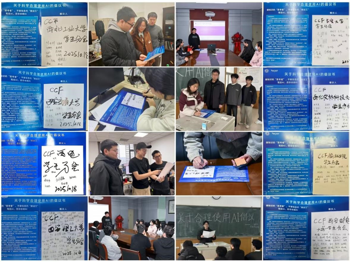本次活动是受邀参加CCF YOCSEF西安组织的“技术赋能下的智慧教育如何守住‘育人’初心”观点论坛的学生代表主导组织的倡议活动,由CCF陕西各高校学生分会主导,从学生自身的视角出发,探索科学合理使用AI的可行性。活动进一步拓展了2025年3月在西北工业大学举办的“DeepSeek与未来AI创新”活动中的讨论成果,体现了CCF陕西各高校学生分会在人工智能与教育融合议题上从技术探索、理念思辨到行动倡导的持续深化。本次倡议活动不仅是理念的倡导,更是持续行动的开始。随着各高校回校宣讲、签署及反馈机制的全面启动,“科学合理使用AI”的理念将在陕西各高校形成燎原之势。未来,CCF陕西各高校学生分会将进一步努力促进科学合理使用AI的理念向全国高校学生传播。