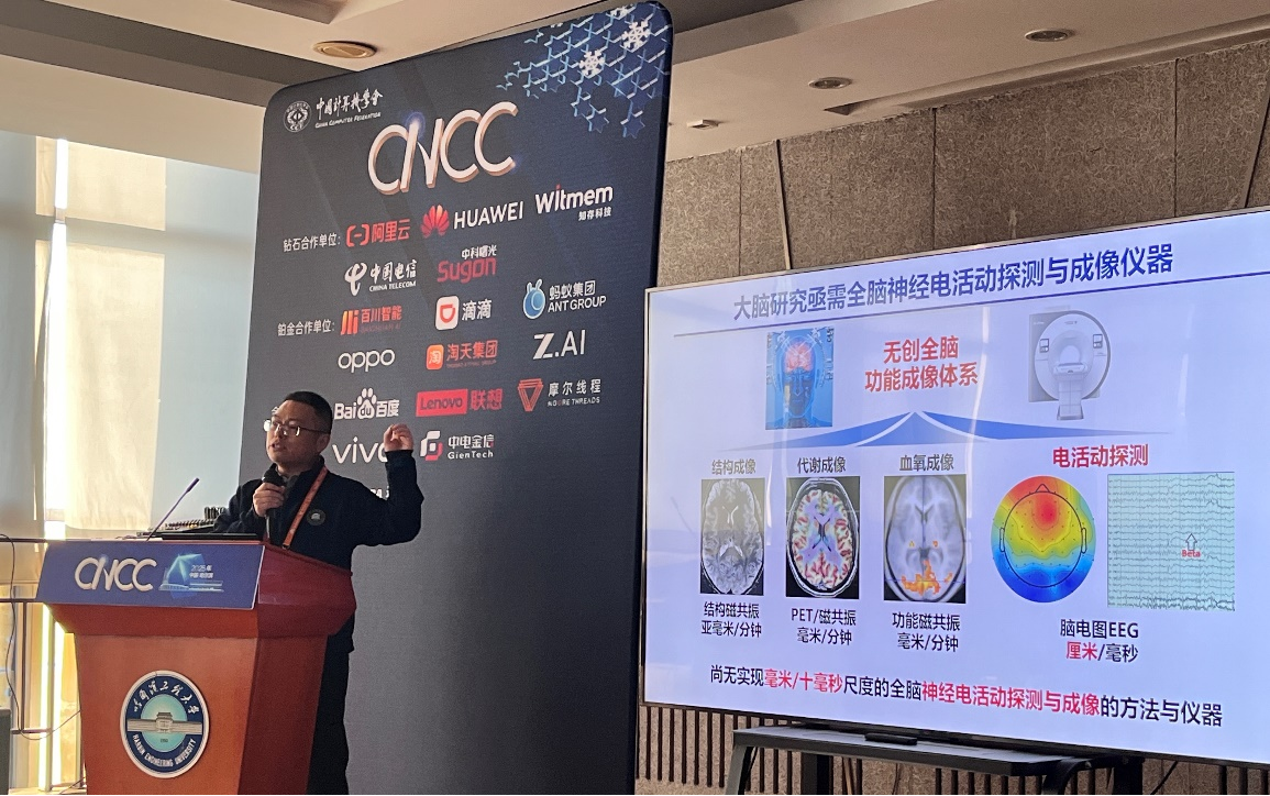 中国科学院深圳先进技术研究院教授梁栋带来了《功能影像与脑机接口》的报告。梁栋从脑科学研究的多尺度特征出发,指出人脑从神经元放电到宏观功能网络的层级活动,是理解智能的关键基础。报告系统梳理了脑机接口的发展历程,涵盖信息的读取、解码与写入三个核心环节,并回顾了侵入式、半侵入式与非侵入式脑机接口的主要类型及各自优势。梁栋强调,脑机接口不仅在医学康复和神经疾病治疗中具有重要应用前景,更是未来人机交互与智能增强的关键途径。他指出,实现真正的“无创、无损、全脑覆盖”的信息交互,是未来脑机通讯的理想方向。围绕这一目标,团队结合磁共振成像与功能影像技术,研发了世界首台5.0T超高场人体磁共振系统,并创新设计了柔性线圈阵列,使皮层信号探测灵敏度提升三倍。梁栋介绍,团队正探索基于神经电活动的快速成像新方法,包括利用磁共振调节、线扫描及电流响应探针,实现毫秒级神经信号的精准捕获,为高时空分辨的功能影像奠定基础。同时,团队提出了物理、化学、数学三种信号放大机制,并结合人工智能建模以提升极弱信号的检测精度。在脑信号解码方面,梁栋展示了融合神经编码机制的多模态解码模型,旨在实现从视觉、语音到情绪的跨模态信息重建。展望未来,他提出“脑际通讯”愿景,即通过无创超声与光声技术,实现自由环境下的人机、甚至跨物种的直接信息交流,为人类社会进入“混合智能”时代描绘了全新图景。