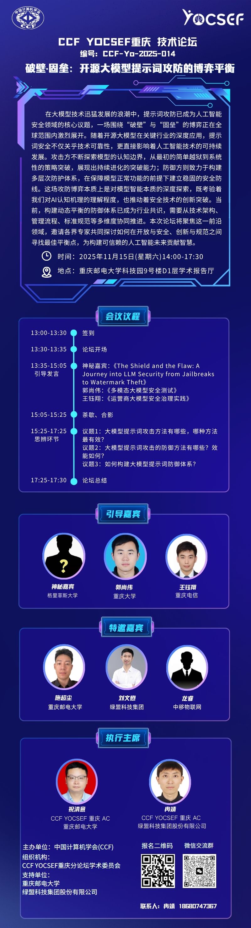【活动预告】CCF YOCSEF重庆将举办“破壁·固垒:开源大模型提示词攻防的博弈平衡“技术论坛