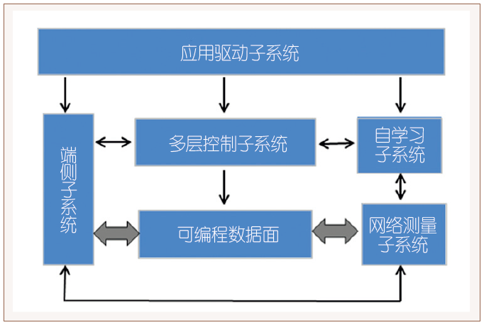 ADN提供面向应用的网络可编程、按需控制和自学习能力,允许在人/机器各类信息消费场景下进行业务体验的多维定制,以达到面向应用效率的优化等。ADN架构的核心功能包括应用驱动子系统、控制子系统、可编程数据面、网络测量子系统和应用驱动的端侧子系统,见图1。