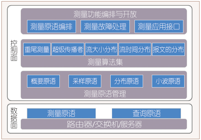 在网络测量中,核心问题是解决测量成本与准确性的矛盾。ADN提出了一个网络测量系统架构,该架构将网络的各种测量行为归纳为一些基本原语,从而可以将服务于各种测量目的的算法进行抽象,为测量应用提供了一个统一的编程模型,见图3。通过此测量原语可以屏蔽不同硬件的差异,为网络状态的感知和智能化奠定一个最根本的基础。网络管理员和开发人员可以基于该抽象模型,方便地进行网络算法的设计、开发与部署。