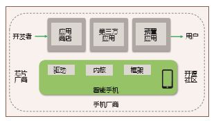 手机厂商、开源社区 Android1框架为应用提供了运行时环境,它由开源社区的软件和谷歌贡献的代码构成。预置应用是手机厂商为了差异化的需要预先安装在设备中的,通常很难卸载或者不可卸载2。厂商为了丰富手机功能,也会对Android框架进行深度定制。