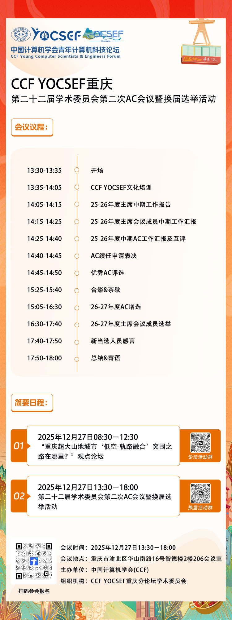【活动预告】CCF YOCSEF重庆将举办第二十二届学术委员会第二次AC会议暨换届选举活动