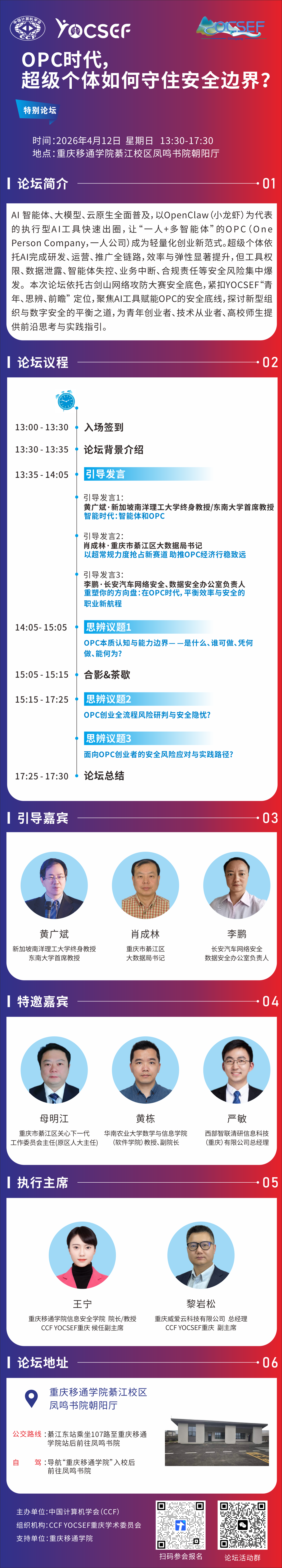 AI智能体、大模型、云原生全面普及,以OpenClaw(小龙虾)为代表的执行型AI工具快速出圈,让“一人+多智能体”的OPC(One Person Company,一人公司)成为轻量化创业新范式。超级个体依托AI完成研发、运营、推广全链路,效率与弹性显著提升,但工具权限、数据泄露、智能体失控、业务中断、合规责任等安全风险集中爆发。本次论坛依托古剑山网络攻防大赛安全底色,紧扣YOCSEF“青年、思辨、前瞻”定位,聚焦AI工具赋能OPC的安全底线,探讨新型组织与数字安全的平衡之道,为青年创业者、技术从业者、高校师生提供前沿思考与实践指引。