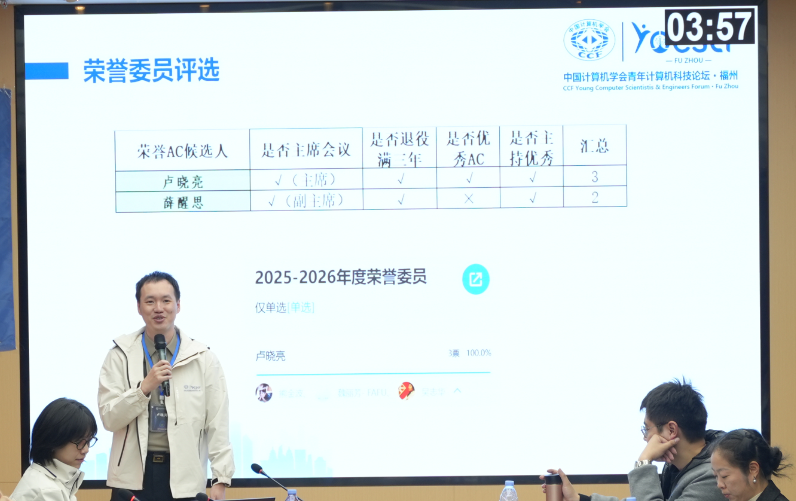 按照 CCF YOCSEF 的规则,任期满 3 年的 AC 委员吴伶、陈潇、焦金涛提出延期申请,经现任 AC 委员现场举手表决,以上延期申请全票通过。