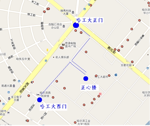路线1:从护军街西苑宾馆门进入哈工大,沿法院街直行300米右转,前行100米,右手边的高层建筑即为正心楼。