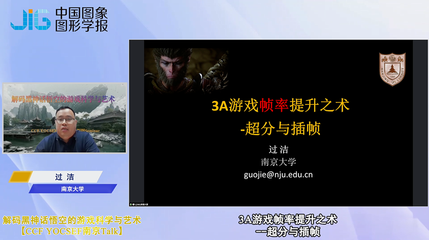 2024年9月1日,CCF YOCSEF南京在中国图象图形学报、CCF南京的支持下,以线上直播的形式组织了首次CCF YOCSEF南京Talk——“解码黑神话悟空的游戏科学与艺术”。活动邀请到了南京航空航天大学魏明强教授、南京大学王贝贝教授、南京大学过洁副教授、南京艺术学院严宝平副教授共同探讨了该游戏在图形建模、渲染、性能优化等方面的核心技术,及游戏科技与艺术深度融合的对外文化传播。论坛设置了专题讨论环节,邀请南京理工大学肖亮教授、南京钟山虚拟现实技术研究院谢海春董事长等专家围绕“江苏能否造就游戏科学的新神话”展开讨论。活动由CCF YOCSEF南京AC委员巫义锐(河海大学)和现任主席吴天星(东南大学)共同主持,吸引了超过7000名观众在线互动参与。