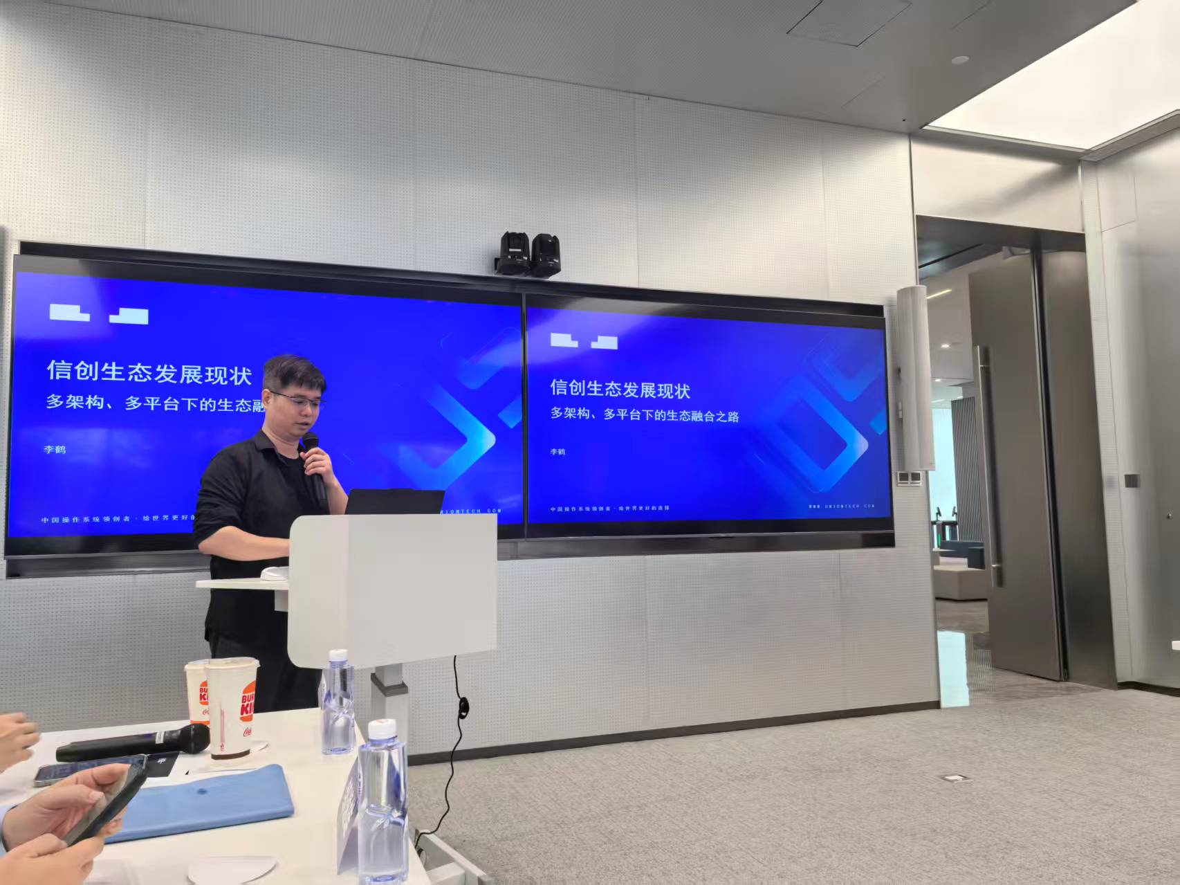 引导发言一来自统信软件终端操作系统产线架构师李鹤,题目是《信创生态发展现状:多架构、多平台下的生态融合之路》,分享针对硬件和软件分裂的现状,使用二进制翻译、wine、虚拟化来进行兼容化的设计。