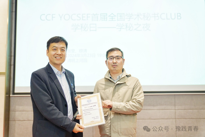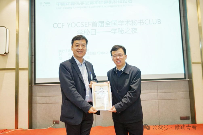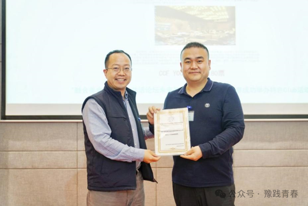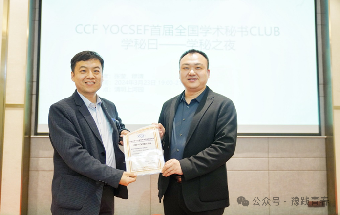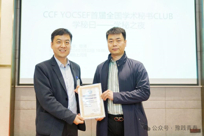 活动伊始,由YOCSEF郑州现任主席张磊致辞。随后张磊向河南大学计算机与信息工程学院(密码学院)、浪潮电子信息产业股份有限公司、河南神州云联信息技术有限公司和郑州云智信安安全技术有限公司颁发感谢证书。