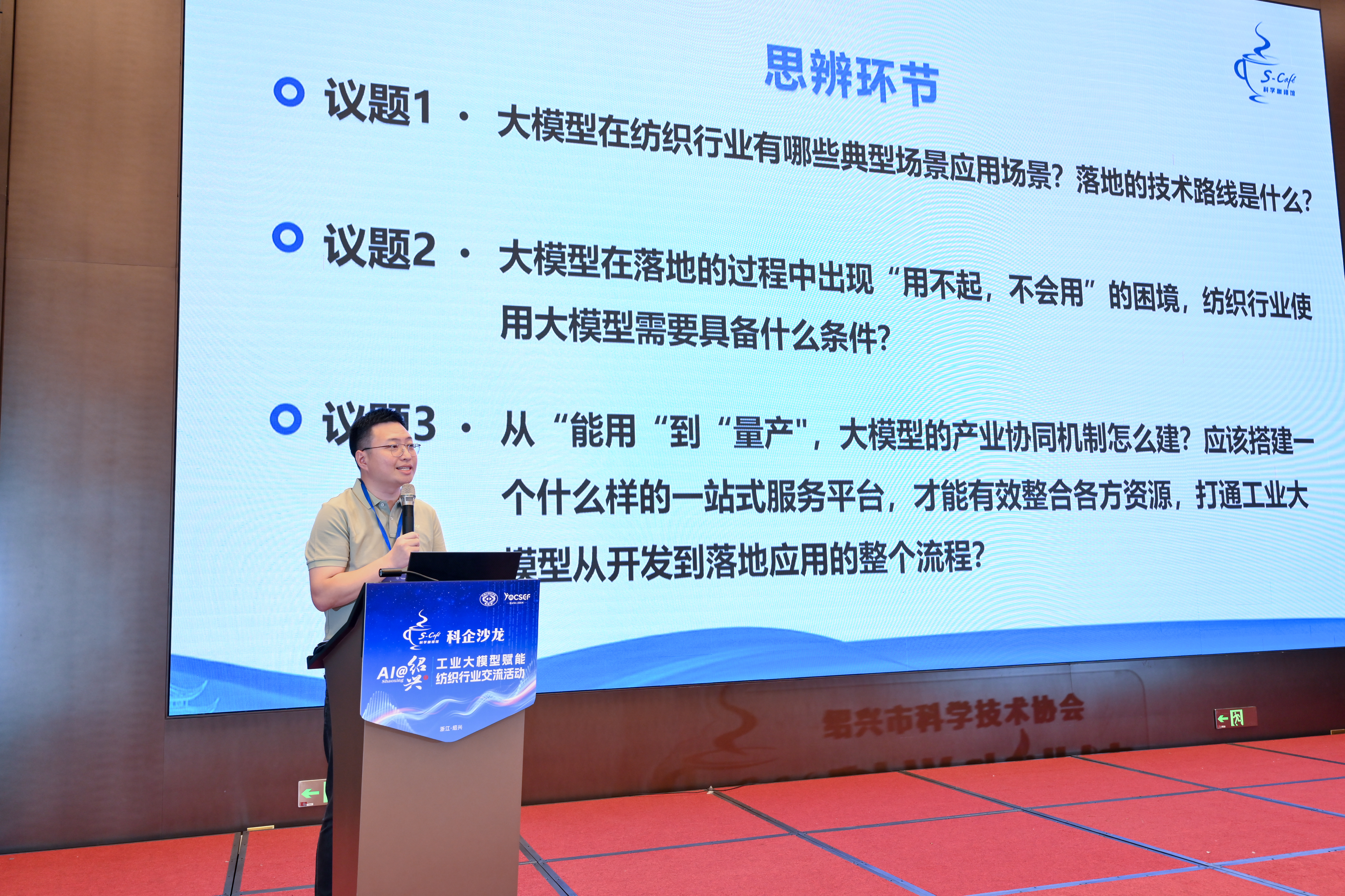 9月27日下午,由中国计算机学会(CCF)主办,中国计算机学会青年计算机科技论坛杭州分论坛(CCF YOCSEF杭州)与绍兴市科学技术协会联合承办的观点论坛 “工业大模型如何在纺织行业落地?”在浙江绍兴举行。此次论坛是绍兴人才周的重要活动之一,同时也是浙江省科学技术协会“科学咖啡馆”品牌活动。此次活动由柯桥区科学技术协会、柯桥区现代纺织产业服务中心、绍兴市现代纺织及生态环境学会、绍兴市纺织工程学会、浙江屹男集团有限公司共同协办。