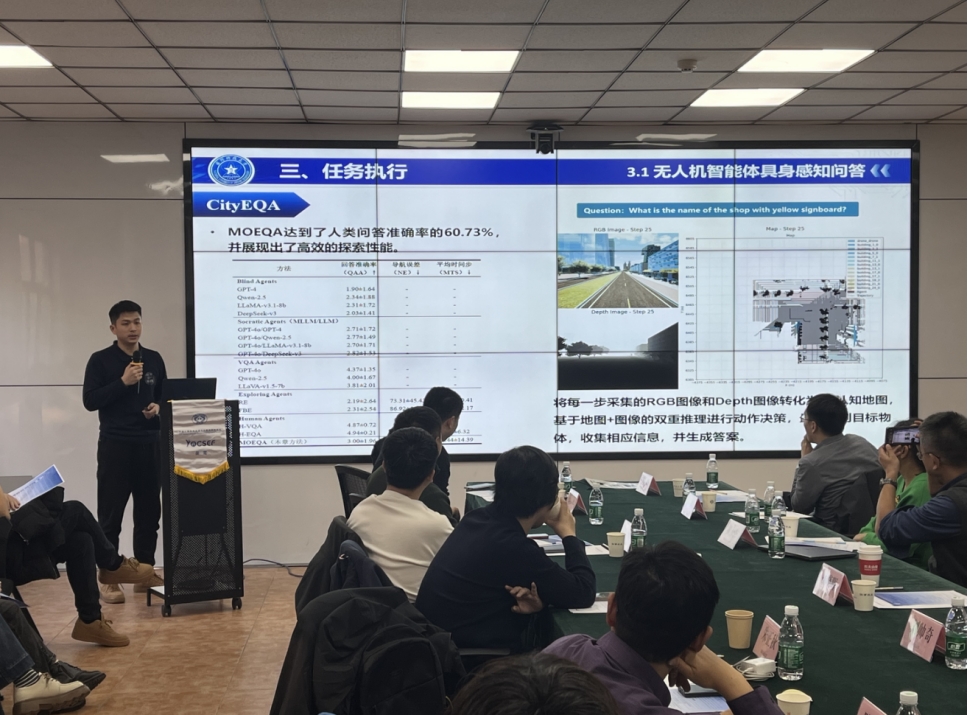 朱正秋(国防科技大学数智建模与仿真国家级重点实验室)在《面向城市感知的具身智能体规划决策方法》引导发言中,重点探讨人机物协同的智能感知。在任务规划层面,针对应急救援等动态场景,提出了空地协同的异构群体强化学习方法,并创新性地引入大模型进行约束松弛,以自主优化任务分配策略。在任务执行层面,聚焦城市场景的两大挑战:一是突破了现有具身感知问答多局限于室内的现状,提出MOEQA模型,在城市场景问答任务中达到人类60.73%的准确率;二是针对城市无人机视觉搜索的空白,构建了融合动态语义、认知吸引与不确定性的多源地图,为复杂环境下的自主目标搜索提供了新方案。未来工作将重点聚焦于物理模拟器、世界模型等方向,以推动技术进一步发展。