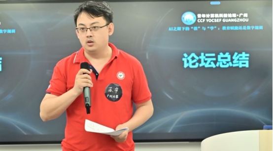 本次论坛由CCF主办,YOCSEF广州学术委员会组织,广东工业大学计算机学院和广州唐邦信息科技有限公司联合支持。YOCSEF广州副主席朱鉴(广东工业大学)和AC委员、候任副主席陈炳丰(广东工业大学)担任本次论坛执行主席。论坛邀请了暨南大学官全龙教授、华南师范大学詹泽慧教授、香港教育大学孙丹儿副教授担任引导嘉宾,上海大学岳晓冬教授、南京邮电大学张珺教授、广州青鹿教育科技有限公司廖力副总经理担任思辨嘉宾。广东工业大学计算机学院院长李小平教授,CCF广州分部秘书长吴一冰(YOCSEF广州2021-2022主席),广东工业大学谭台哲(YOCSEF广州2014-2015主席)、中山大学李冠彬(YOCSEF广州2024-2025主席),往届副主席高静(广东恒电信息科技股份有限公司)、孙为军(广东工业大学),荣誉AC刘雷(广东科技报社),YOCSEF广州现任主席苏申(广州大学)、现任副主席姜思羽(广东外语外贸大学)、陈俊颖(华南理工大学),现任学术秘书李雯霖(广东财经大学),AC委员黄培涛(广州唐邦信息科技有限公司)、崔金荣(华南农业大学)、张帆(云米)、李宇翔(头歌平台),候任AC委员邱少健(华南农业大学)、胡宇(广东工业大学),以及陈薇(广东工业大学)、王甜甜(北京优诺UINO)、王映梅(广州唐邦信息科技有限公司)、潘俊修(广州恒联)等来自多家单位的40余位代表参与论坛。