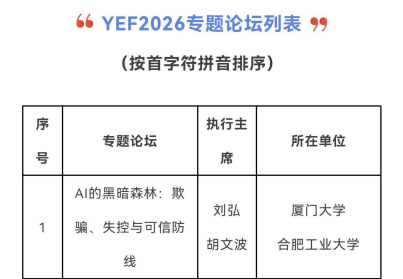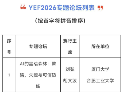 本次筹备活动的核心背景,是YEF2026专题论坛评审结果的正式公布。2026 414日,经YEF论坛委员会审议,从全国40份论坛申请中最终遴选出18 个专题论坛,内容覆盖 AI4Science、具身智能、脑科学与类脑、智能体、人工智能安全、量子科技、大模型、数据空间、先进计算、算力与芯片等计算机领域前沿热点方向。其中,由CCF YOCSEF合肥与CCF YOCSEF厦门联合申报、厦门大学刘弘与合肥工业大学胡文波担任执行主席的专题论坛《AI 的黑暗森林:欺骗、失控与可信防线》成功入选,成为本届 YEF 大会聚焦人工智能安全方向的核心专题论坛之一。
