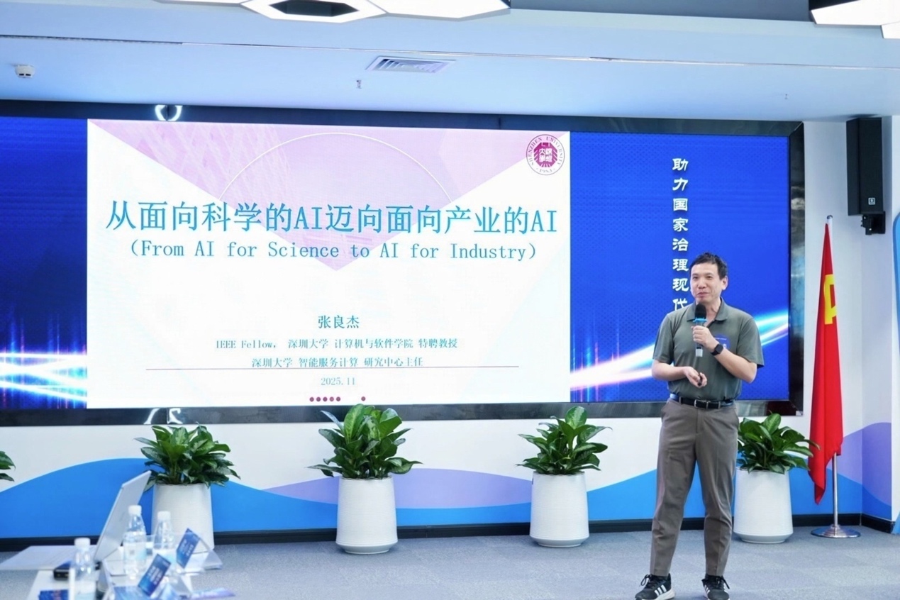 深圳大学计算机与软件学院特聘教授张良杰带来题为《从面向科学的AI迈向面向企业的产业的AI(From AI for Science to AI for Industry)》的报告。张良杰提出面向科学的人工智能AI for Science)和面向产业的人工智能AI for Industry),二者并非割裂,可相互推动并形成“探索未知-价值落地-需求反哺”的完整链路。他指出AI for Science以AI算力、推理与生成能力赋能科研,核心是破解未知,技术上侧重复杂建模、理论研究与仿真研究,对精度和泛化性要求高,依赖实验与模拟数据,不强调实时性。AI for Industry聚焦工程化价值,强调全流程智能协同、降本增效,还能以场景数据反哺科研,形成创新闭环。典型案例包括用模糊神经网络设计智能空调控制器、雅诗兰黛集团凭借AI与大数据打造智能零售生态以及特斯拉FSD 14.0凭借AI生成数据训练实现全自动驾驶等。最后,他表示AI从早年手工调神经网络发展到如今大模型时代,效率大幅提升。未来AI或能设计机器人与控制器,进化为智能劳动力,在“Human Being”的世界中出现“AI being”,这会进一步引发人类与AI共存合作的深度思考。