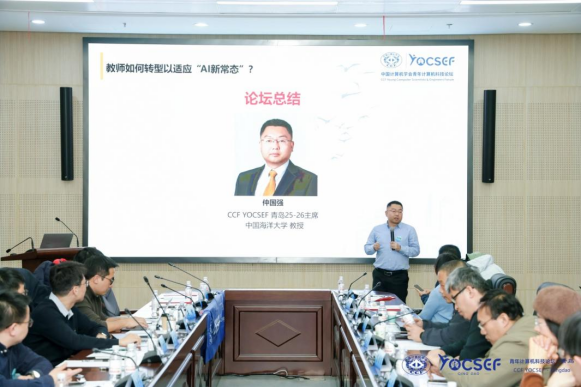 论坛最后,CCF YOCSEF青岛主席仲国强作总结发言。他说,与会专家形成三大共识:一是教育本质是人的培养,AI仅为辅助工具,教师“传道、授业、解惑”的核心价值不可替代; 二是教师转型需以AI素养提升为核心,实现从“使用AI”到“驾驭AI”的跨越; 三是技术赋能与人文关怀需协同发展,教师应在坚守人文底色的基础上,充分发挥AI工具价值。本次论坛通过深度思辨,为AI时代教师转型明确了核心方向与实践路径,为推动教育高质量发展注入了新动能。