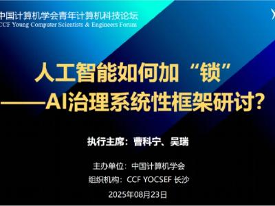 当前,人工智能治理已成为全球高度关注的热门话题,数字化时代大模型的发展渗透各行各业,然而全球AI发展与治理的平衡协调却充满不确定性与挑战。基于上述背景,2025年08月23日,由中国计算机学会(CCF)主办、CCF Y...
