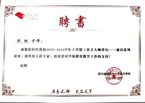 本次“蓉智汇”活动不仅让同学们对人工智能有了系统而形象的认识,也激发了他们对科技未来的无限想象,更在年轻心灵中播下了科技梦想与责任意识的种子。同时,刘昶受聘为七中水井坊校区《育才大咖讲坛——通识系列讲座》课程的主讲专家,标志着CCF YOCSEF成都在推动青少年前沿科技通识教育方面迈出了坚实一步。未来,CCF YOCSEF成都会继续推动前沿科技普及与青少年教育融合,助力未来数字公民的成长与培育。